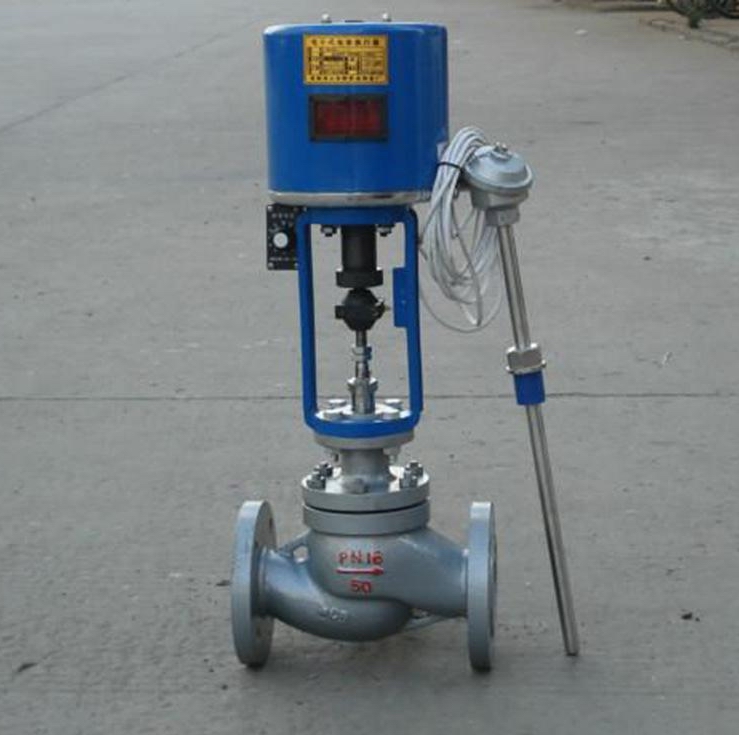 由单座调节阀、电动执行机构、温度传感器和温度调节器等部件组成,根据用户需要,分别有加热型与冷却型两种结构。加热型调节阀的结构与原理,工作前主阀芯处于半开位置,传感器处于自然状态。接上电源,主阀芯全开。介质由箭头方向流入主阀体、经阀芯对储热箱进行加热。当温度升到相应设定值时,传感器即产生相应线性信号输入一体化执行机构,随即驱动阀杆、阀芯产生位移,关闭主阀芯停止加热。当温度低于设定值时,传感器即产生线性信号输入一体化执行机构,驱使阀芯渐开,使介质按抛物线特性流入储热箱,进行加热直至设定值。这样被控介质始终在设定温度范围内被控制,从而达到控温目的。