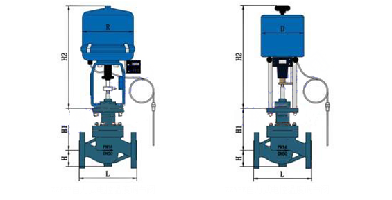 由单座调节阀、电动执行机构、温度传感器和温度调节器等部件组成,根据用户需要,分别有加热型与冷却型两种结构。加热型调节阀的结构与原理,工作前主阀芯处于半开位置,传感器处于自然状态。接上电源,主阀芯全开。介质由箭头方向流入主阀体、经阀芯对储热箱进行加热。当温度升到相应设定值时,传感器即产生相应线性信号输入一体化执行机构,随即驱动阀杆、阀芯产生位移,关闭主阀芯停止加热。当温度低于设定值时,传感器即产生线性信号输入一体化执行机构,驱使阀芯渐开,使介质按抛物线特性流入储热箱,进行加热直至设定值。这样被控介质始终在设定温度范围内被控制,从而达到控温目的。