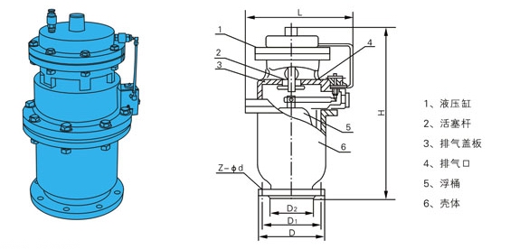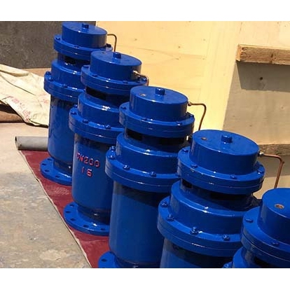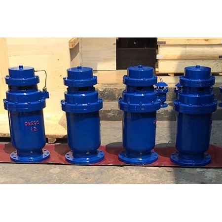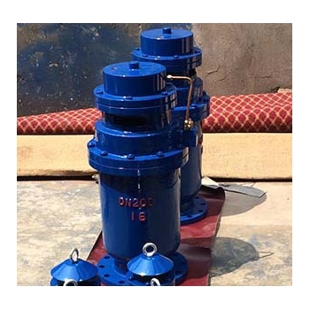 QSP全压高速排气阀由下阀体,中阀体,浮筒,浮筒杆,阀芯,盖板,活塞杆,膜片及阀盖等组成的全压高速排气阀,其特征是通过销轴与浮筒铰接的浮筒杆可绕主轴转动,并由此实现通过浮筒升降控制阀芯的升降启闭,即当浮筒下降(阀体里充满气体)时,阀芯上升,打开小阀口,并关闭小排气帽上的排气口,使气体通过导管进入液压罐内,当浮筒在浮力作用下上升时候,阀芯下降,关闭小阀口,同时打开排气帽上的排气口,使液压罐通过导管,直通大气泄压,且当浮筒下降,液压缸内充满气体时,阀门上的大排气口自动关闭。当水泵停止,管内水流空时或遇到管内产生负压时,吸入空气,确保管线安全。