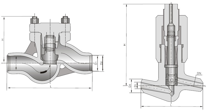 H61Y、H61H高压升降式止回阀支管两端为焊结结构,焊结坡口可按标准或用户要求制作,适用于火电厂、石油化工、冶金等高温高压的水、蒸气、油品、过热蒸汽的管道上作防止介质回流的装置。