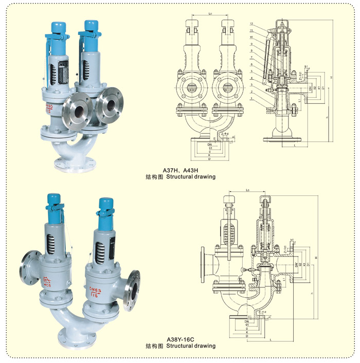A38Y、A43H、A37H双联弹簧式安全阀适用于工作温度≤350℃的蒸汽、水等介质的设备和管路上。作为超压保护装置。A38Y、A43H、A37H型双联弹簧式安全阀是在Y型接头上装设两个同样规格的A48Y或A47H型安全阀而构成,其公称通径系列指Y型接头进口通径。