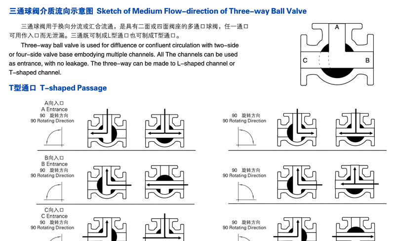 气动三通球阀分L型和T型,介质流通方向见下图。L型气动三通球阀适用于介质流向的切换,能使相互垂直的两个通道连通:T型气动三通球阀适用于介质的分流、合流或流向 切换,T型孔道可以使三个通道互相连通或使其中两个通道连通,气动三通球阀一般采用三个阀座结构,亦可根据用户要求采用四阀座结构。