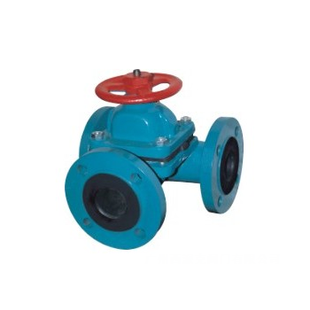 G49J三通衬胶隔膜阀是一种特殊形式的截断阀,启闭件采用EPDM橡胶材料制成的隔膜,把阀体内腔与阀盖内腔及驱动部件隔开,下部阀体内腔与上部阀盖内腔隔开,使位于隔膜上方的阀杆、阀瓣等零件不受介质腐蚀,省去了填料密封结构,且不会产生介质外漏,阀体流道采用全衬胶设计,避免阀体受工况介质腐蚀,增加了阀门使用寿命。衬胶隔膜阀专用于控制非腐蚀性或一般腐蚀性介质,阀体,内腔表面无衬里或覆有可供选择的各种橡胶,适用于不同工作温
