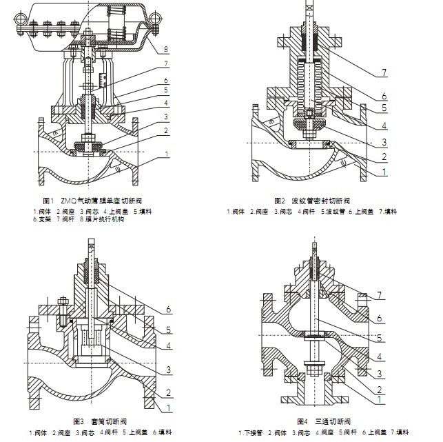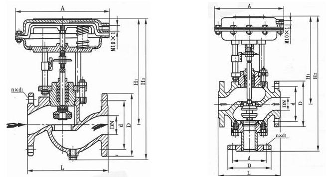 (1)气动薄膜切断阀采用多弹簧执行机构与调节机构用三根立相连,整个高度可减小约30%,重量可减轻约30%。