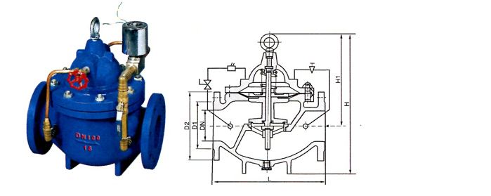 700X水泵控制阀当水泵工作阀门向下游供水时,电磁导阀全开,针阀调到适当开度,上游水经过针阀,导阀,单向阀进入主阀控制室,经电磁导阀流出,此时主阀控制室压力保持主阀处于合适开度,保持下游正常供水。