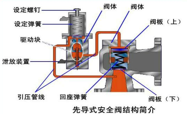 常规的先导式安全阀,通常保持闭合的阀通过弹簧或类似机构而按压盘或活塞在座椅上,强行打开,如果压力值大于机械弹簧。在对管道保持关闭的状态下,少量的流体位于密封盘,所述压力平衡管。单独的促动器在释放管道中的压力线如果它穿越阈值。这种压力释放的密封,使得阀打开。其主要部件是一个先导阀导频(或控制)、主阀,一个引导管,该圆盖、盘或活塞和座。在活塞上方的容积是所谓的穹顶。